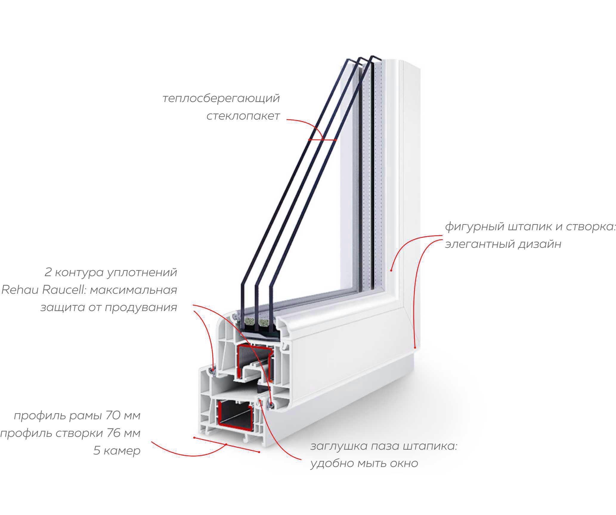 Окна Thermo76 включают инновационные уплотнения Rehau Raucell, надежно защищающие от продувания, влаги и пыли и не теряющие своих свойств со временем. Уплотнение Raucell сделано из сотового каучука, имеющего множество микроскопических воздушных камер, надежно сохраняющих тепло на участке прижима рамы и створки.